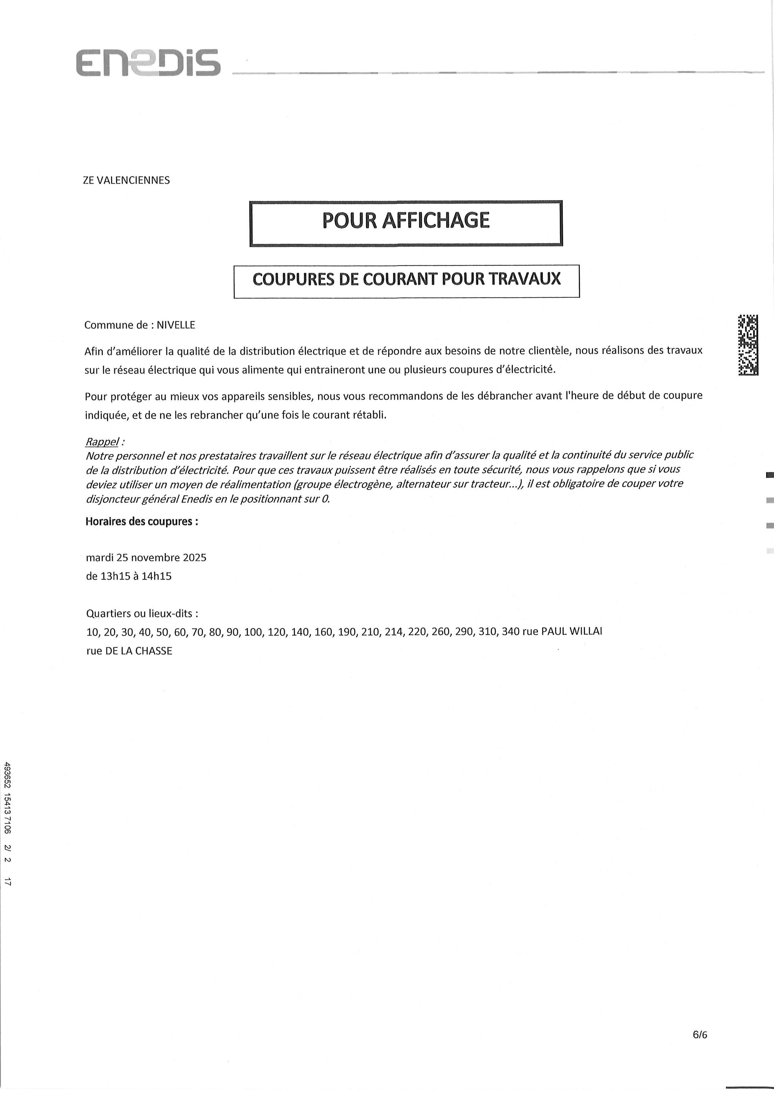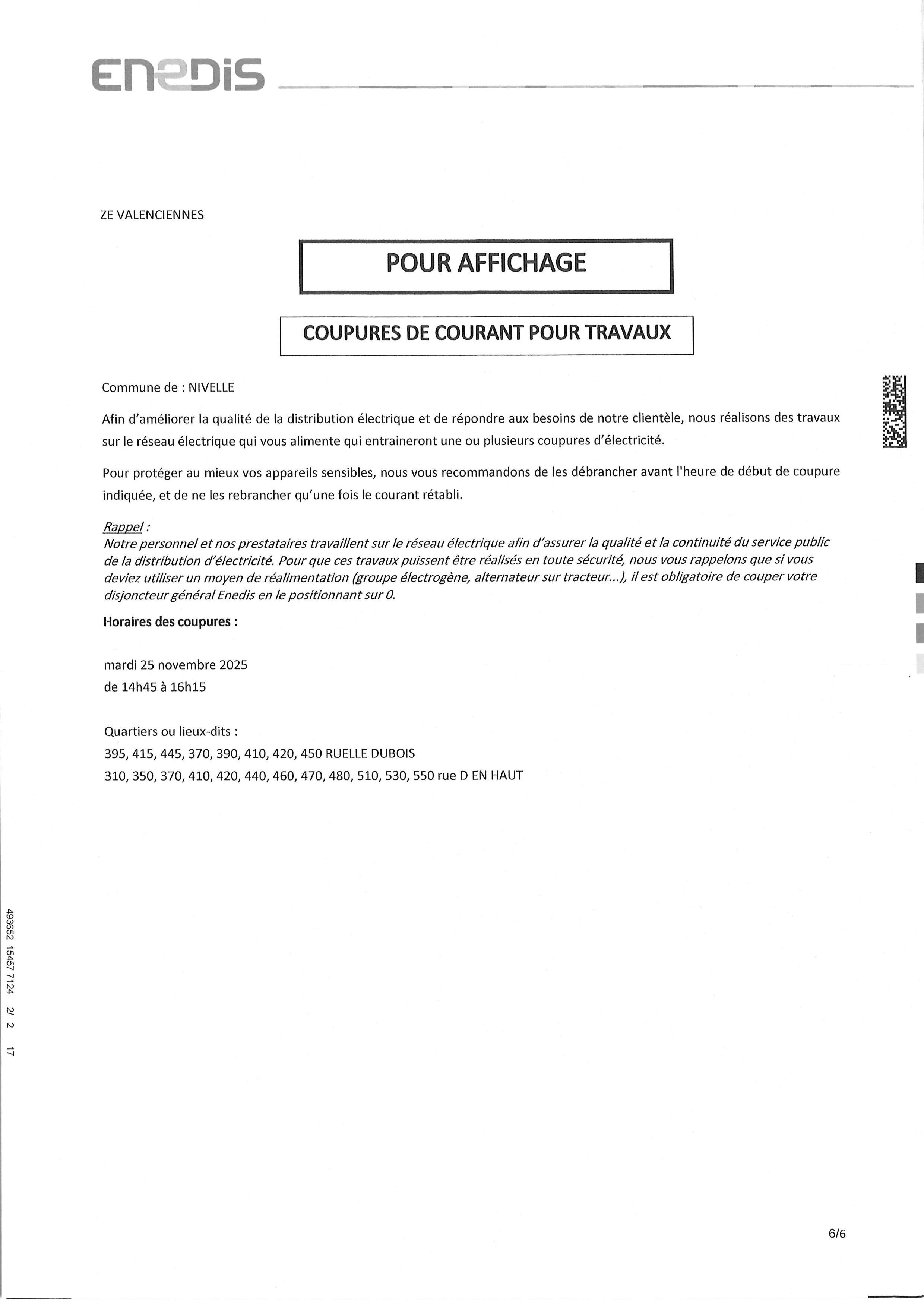 Afin d'améliorer la qualité et la distribution électrique et de répondre aux besoins de sa clientèle, Enedis réalisera des travaux le mardi 25 Novembre 2025 sur le réseau électrique qui alimente les rues (voir affichage ci-dessous) et qui entraineront une ou plusieurs coupures d'électricité.
