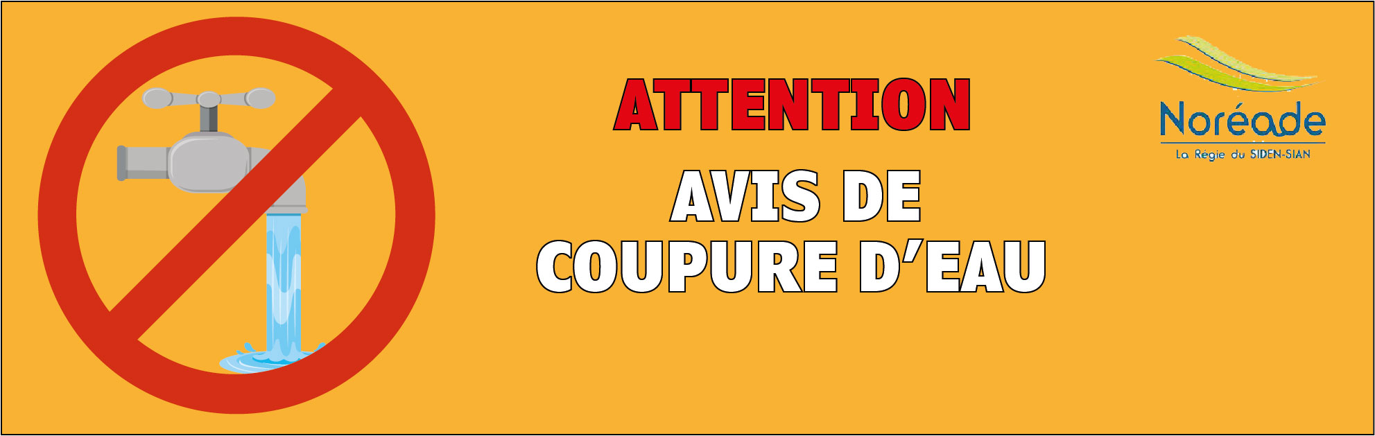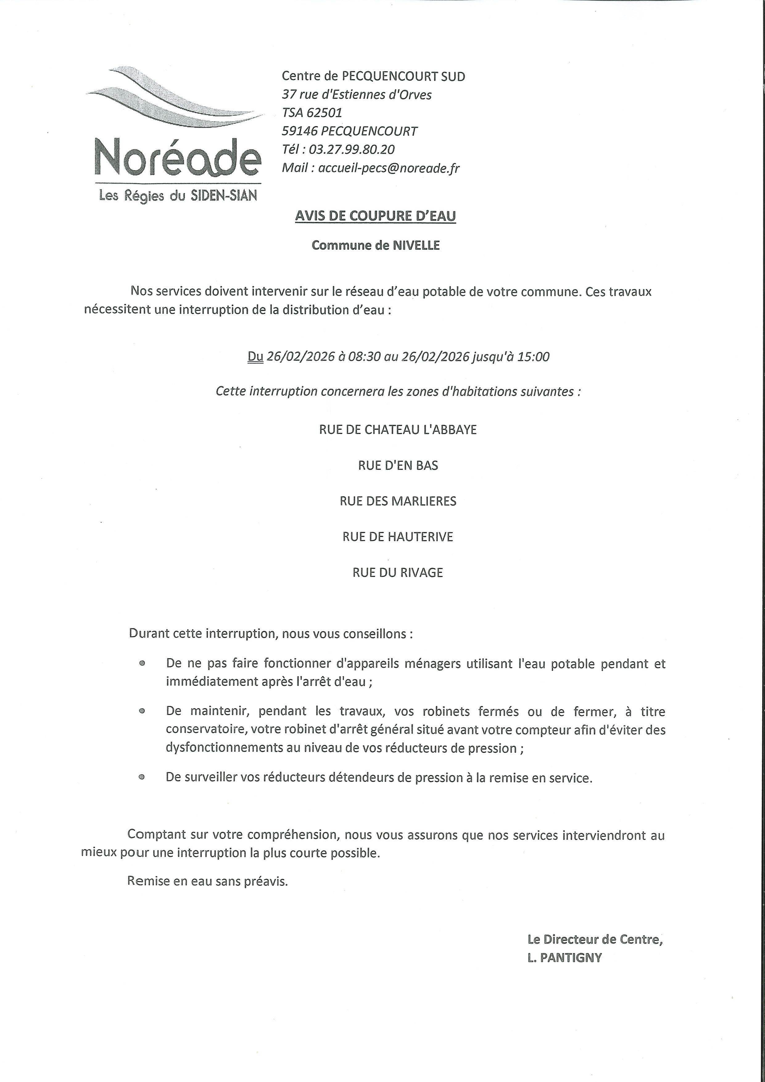 Les services de Noréade doivent intervenir sur le réseau d'eau potable de la commune. Ces travaux nécessitent une interruption de la distribution d'eau le jeudi 26 Février 2026 de 08h30 à 15h00 - rue de Château L'Abbaye, rue d'en Bas, rue des Marlières, rue Hauterive et Le Rivage. Durant cette interruption, nous vous conseillons : de ne pas faire fonctionner d'appareils ménagers utilisant l'eau potable pendant et immédiatement après l'arrêt de l'eau ; de maintenir, pendant les travaux, vos robinets fermés ou de fermer, à titre conservatoire, votre robinet d'arrêt général situé avant votre compteur afin d'éviter des dysfonctionnements au niveau de vos réducteurs de pression ; de surveiller vos réducteurs détendeurs de pression à la remise en service.
