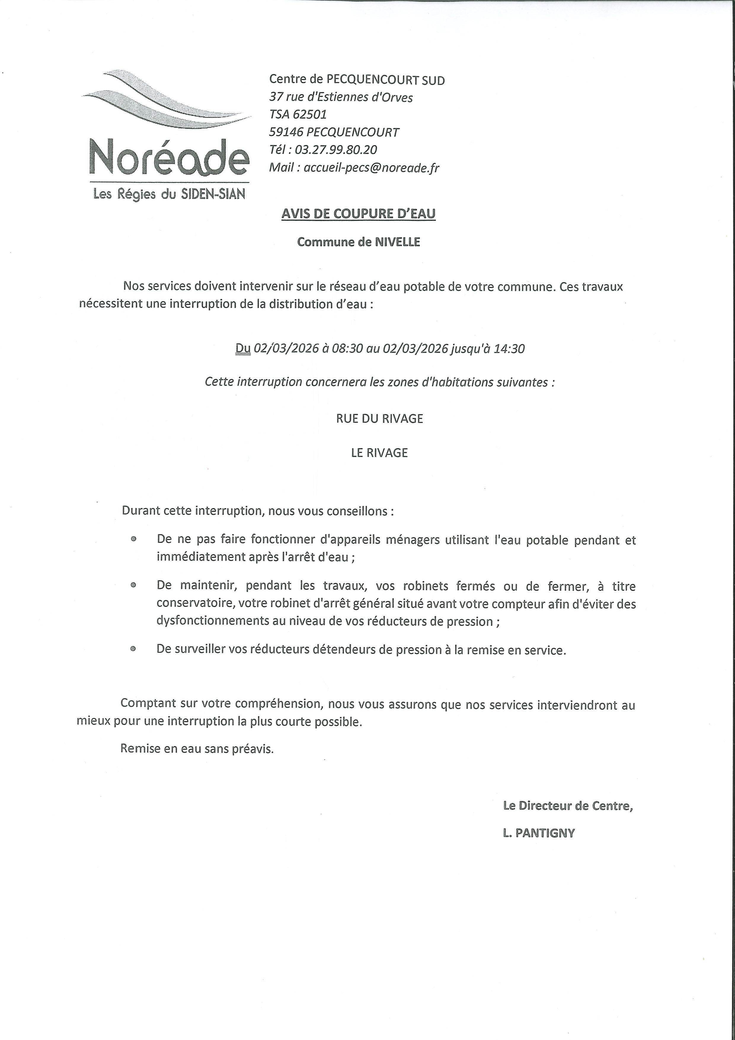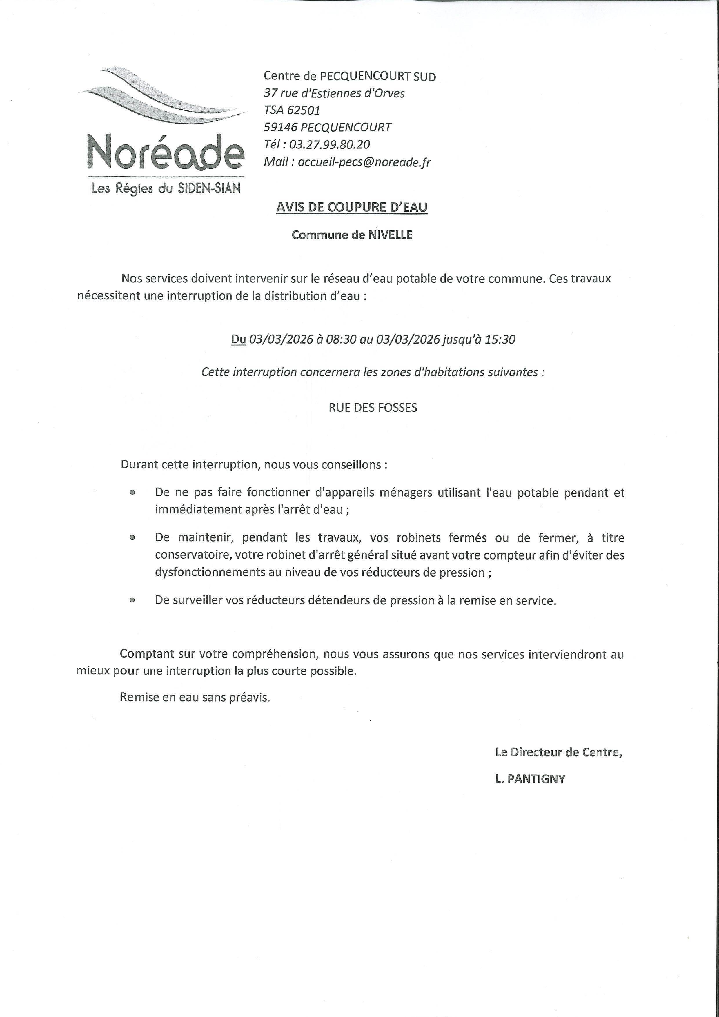Les services de Noréade doivent intervenir sur le réseau d'eau potable de la commune. Ces travaux nécessitent une interruption de la distribution d'eau le lundi 02 Mars 2026 de 08h30 à 14h30 - Le Rivage et le mardi 03 Mars 2026 de 08h30 à 15h30 - Rue des Fossés. Durant cette interruption, nous vous conseillons : de ne pas faire fonctionner d'appareils ménagers utilisant l'eau potable pendant et immédiatement après l'arrêt de l'eau ; de maintenir, pendant les travaux, vos robinets fermés ou de fermer, à titre conservatoire, votre robinet d'arrêt général situé avant votre compteur afin d'éviter des dysfonctionnements au niveau de vos réducteurs de pression ; de surveiller vos réducteurs détendeurs de pression à la remise en service.