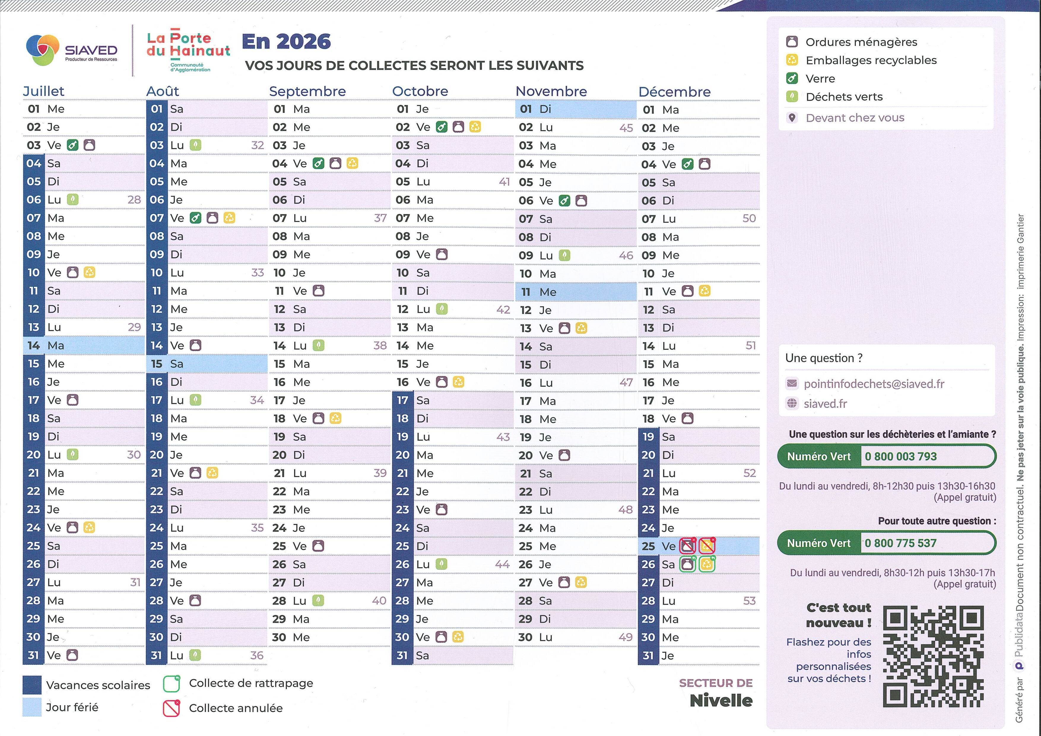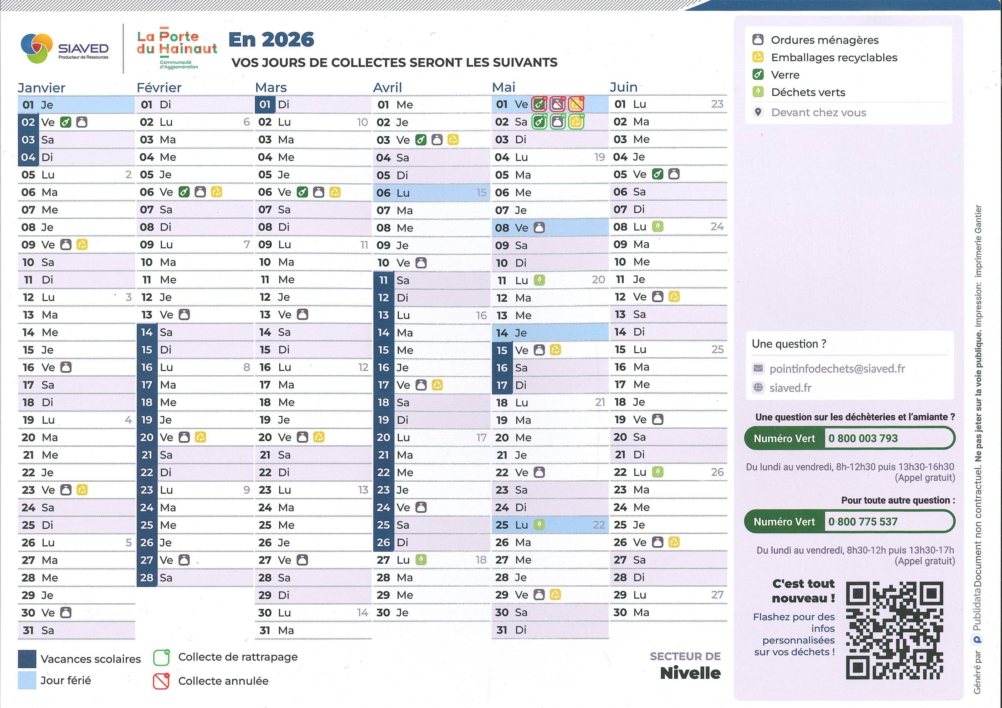 Vous trouverez ci-dessous le nouveau calendrier de collecte (ordures ménagères, tri sélectif, verre et déchets verts) pour l'année 2026 au format image pour consultation ou au format PDF pour téléchargement. Attention la collecte du vendredi 1er Mai est reportée au samedi 2 Mai et celle du vendredi 25 Décembre au samedi 26 Décembre.